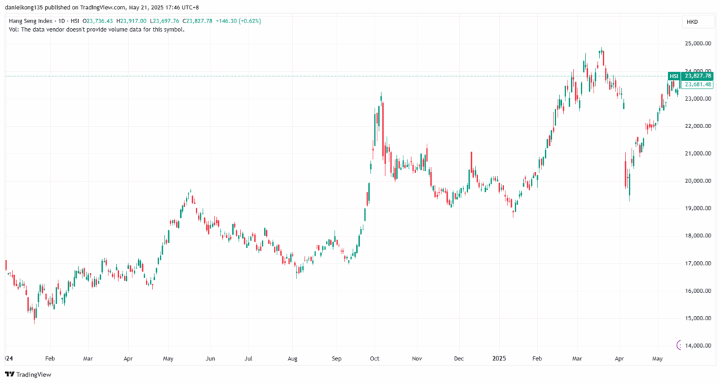 Biểu đồ 1: Biểu đồ giá hàng ngày của Chỉ số Hang Seng từ tháng 1 năm 2024 đến tháng 5 năm 2025. Nguồn: https://www.tradingview.com/x/KzmRxROx/