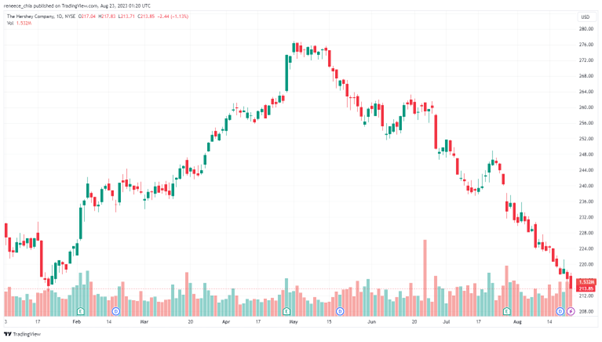 Năm 2023, giá cổ phiếu của Hershey đã trải qua những biến động theo chiều hướng tăng, đạt mức cao nhất mọi thời đại là 276,35 đô la vào ngày 1 tháng 5. Kể từ đó, giá cổ phiếu đã giảm mạnh, xuống còn 213,85 đô la vào ngày 23 tháng 8.