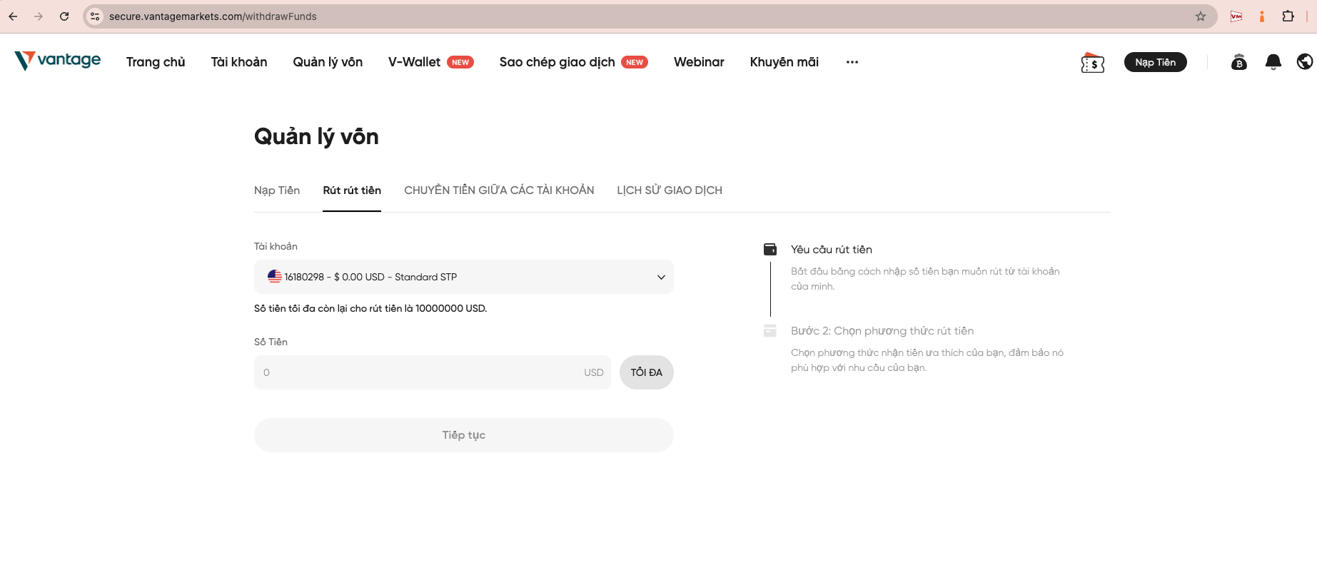 Việc rút tiền MT4 tại Vantage rất đơn giản và nhanh chóng. Bạn chỉ cần thực hiện vài thao tác cơ bản ngay trên nền tảng. Thông thường, thời gian rút tiền tại Vantage sẽ được thực hiện ngay lập tức chỉ mất 1-5 phút. Điều này giúp trader dễ dàng chủ động dòng vốn để tiếp tục chiến lược giao dịch.