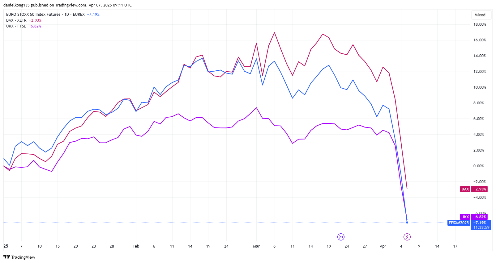 Thị trường châu Âu mở cửa giảm mạnh vào ngày 7 tháng 4, kéo dài tổn thất nghiêm trọng của tuần trước khi thuế quan của Trump làm dấy lên lo ngại của các nhà đầu tư. Có thời điểm, hợp đồng tương lai Euro Stoxx 50 giảm hơn 6%, kéo dài mức giảm 8% so với hai phiên trước. Chỉ số DAX của Đức, nơi chịu ảnh hưởng lớn từ thương mại toàn cầu, đã giảm 10% khi mở cửa, trong khi CAC 40 của Pháp giảm 6,6% và FTSE MIB của Ý giảm 5,7%. Tại Anh, FTSE 100 giảm 6%, xuống mức thấp nhất trong một năm là 7.566.