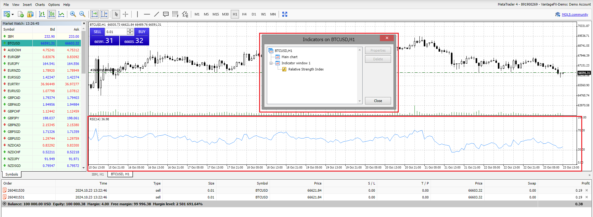 Ở đây, chúng tôi đã thêm Chỉ số sức mạnh tương đối (RSI) xuất hiện dưới dạng bảng riêng ở cuối màn hình.