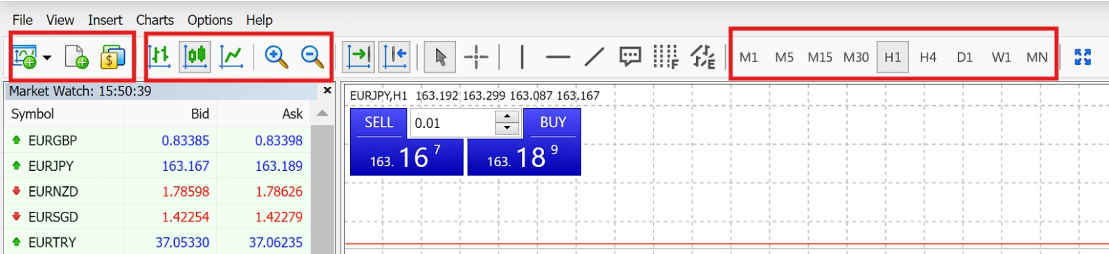Với nhóm ký hiệu đầu tiên (hình vuông ngoài cùng bên trái), bạn có thể tạo biểu đồ mới, bắt đầu lệnh mới hoặc chọn từ nhiều thị trường khác ngoài forex. (MT4, mặc dù tập trung nhiều vào forex, nhưng cũng hỗ trợ giao dịch cổ phiếu, hàng hóa và trái phiếu, cùng nhiều loại khác.) Chúng ta sẽ xem xét từng nút chi tiết hơn sau.