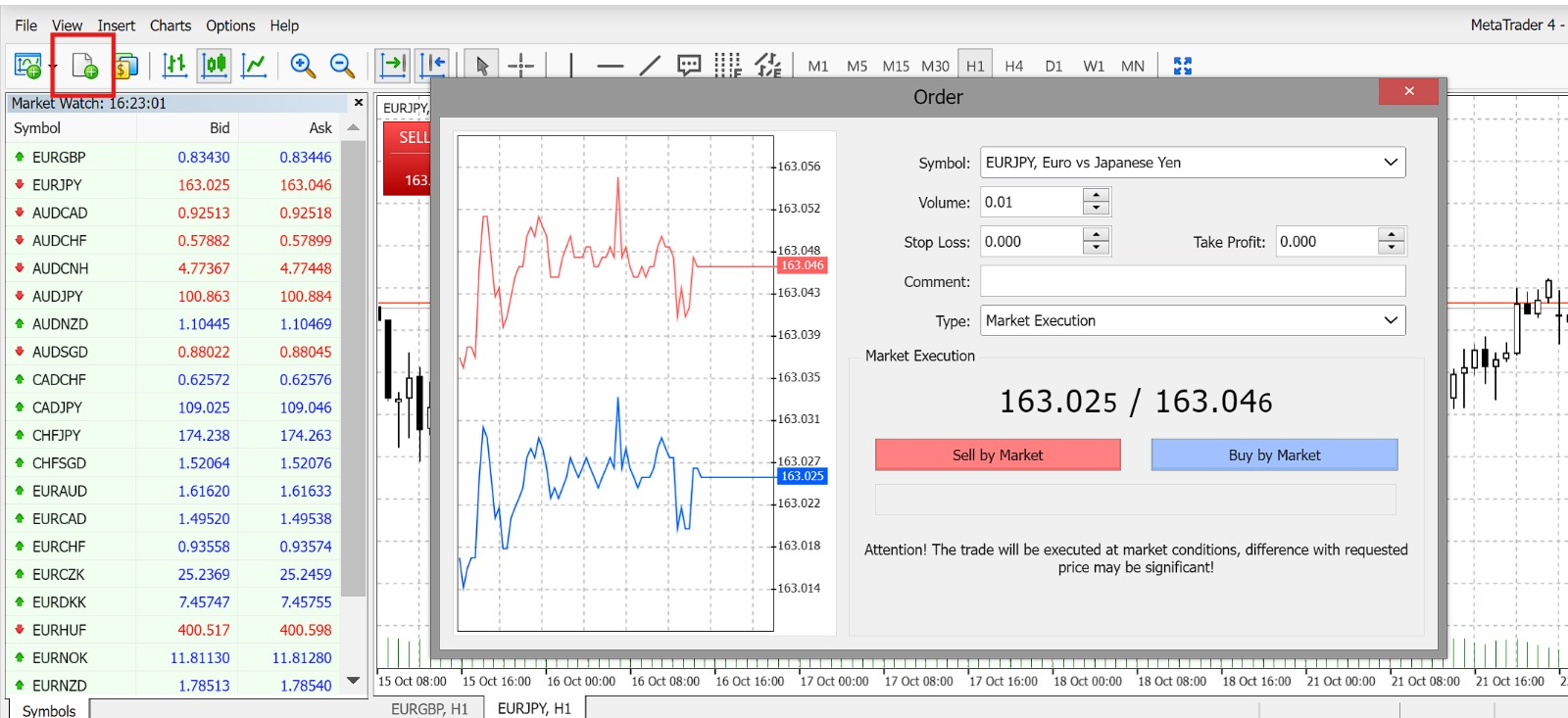 Chọn cặp tiền tệ bạn muốn giao dịch từ Market Watch, sau đó nhấp vào biểu tượng “New Order” (hình vuông màu đỏ). Thao tác này sẽ đưa ra menu phụ order.