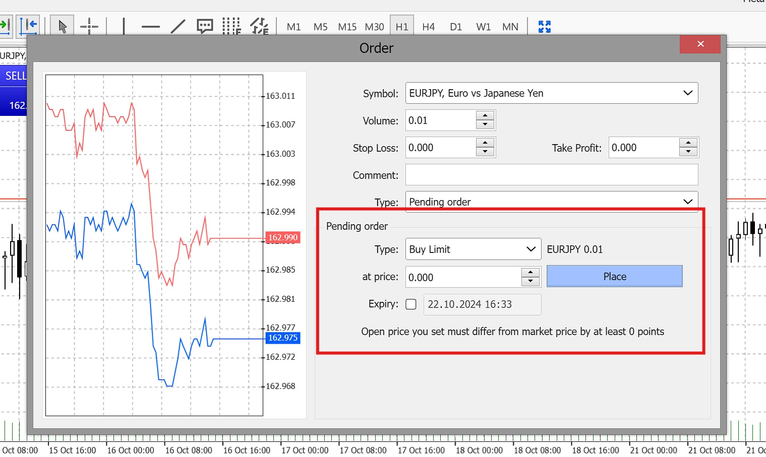 Như đã thấy trong ảnh chụp màn hình ở trên, việc chọn Lệnh chờ sẽ gọi ra một số tùy chọn mới, bao gồm Order Type (Buy Limit, Sell Limit, Buy Stop, Sell Stop), cũng như một trường để bạn đặt giá mà bạn muốn giao dịch để thực hiện. Bạn cũng có thể đặt ngày hết hạn cho lệnh của mình.