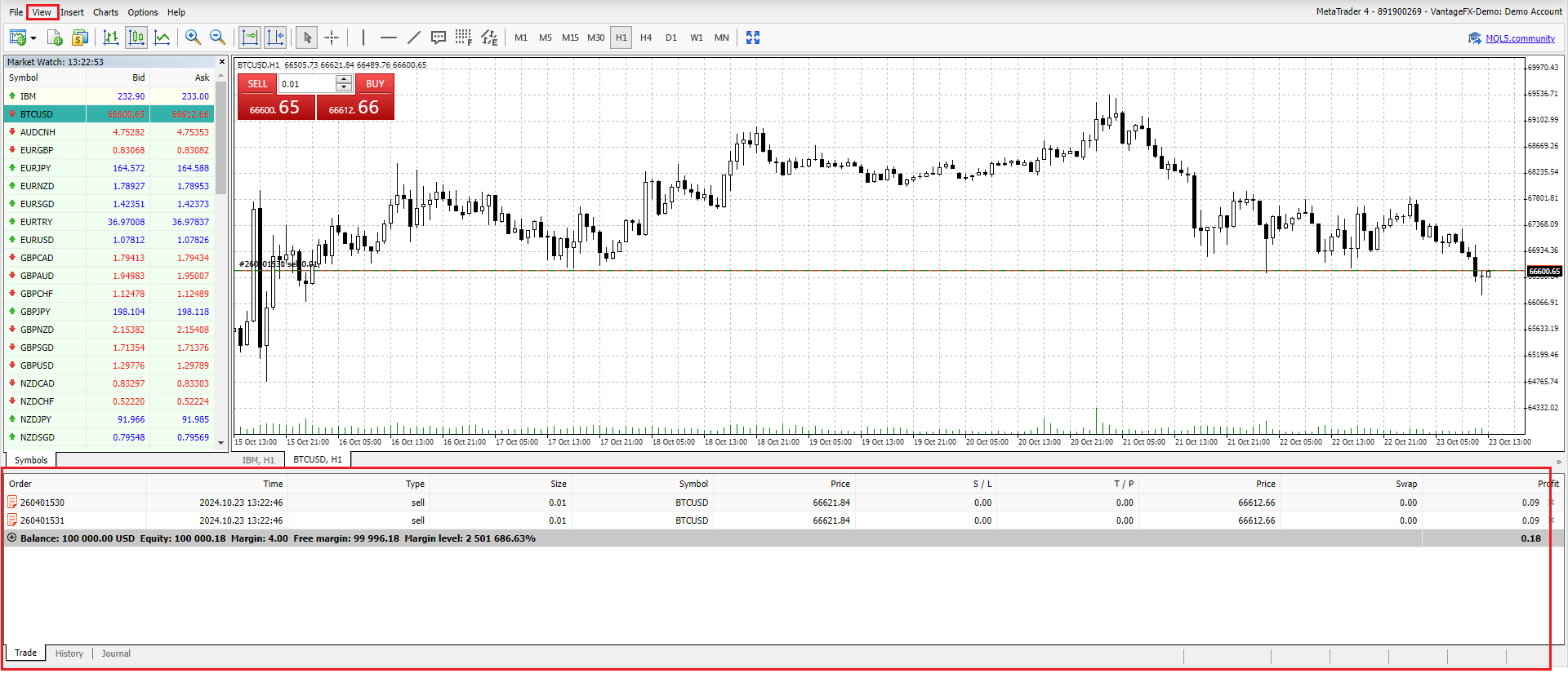 Bây giờ di chuyển xuống dưới, khu vực được đánh dấu bằng màu đỏ bên trái là Market Watch của nền tảng, về cơ bản là danh sách theo dõi các cặp tiền tệ chính trên thị trường. Bạn có thể bật hoặc tắt bảng điều khiển này thông qua “View” trên thanh công cụ trên cùng.