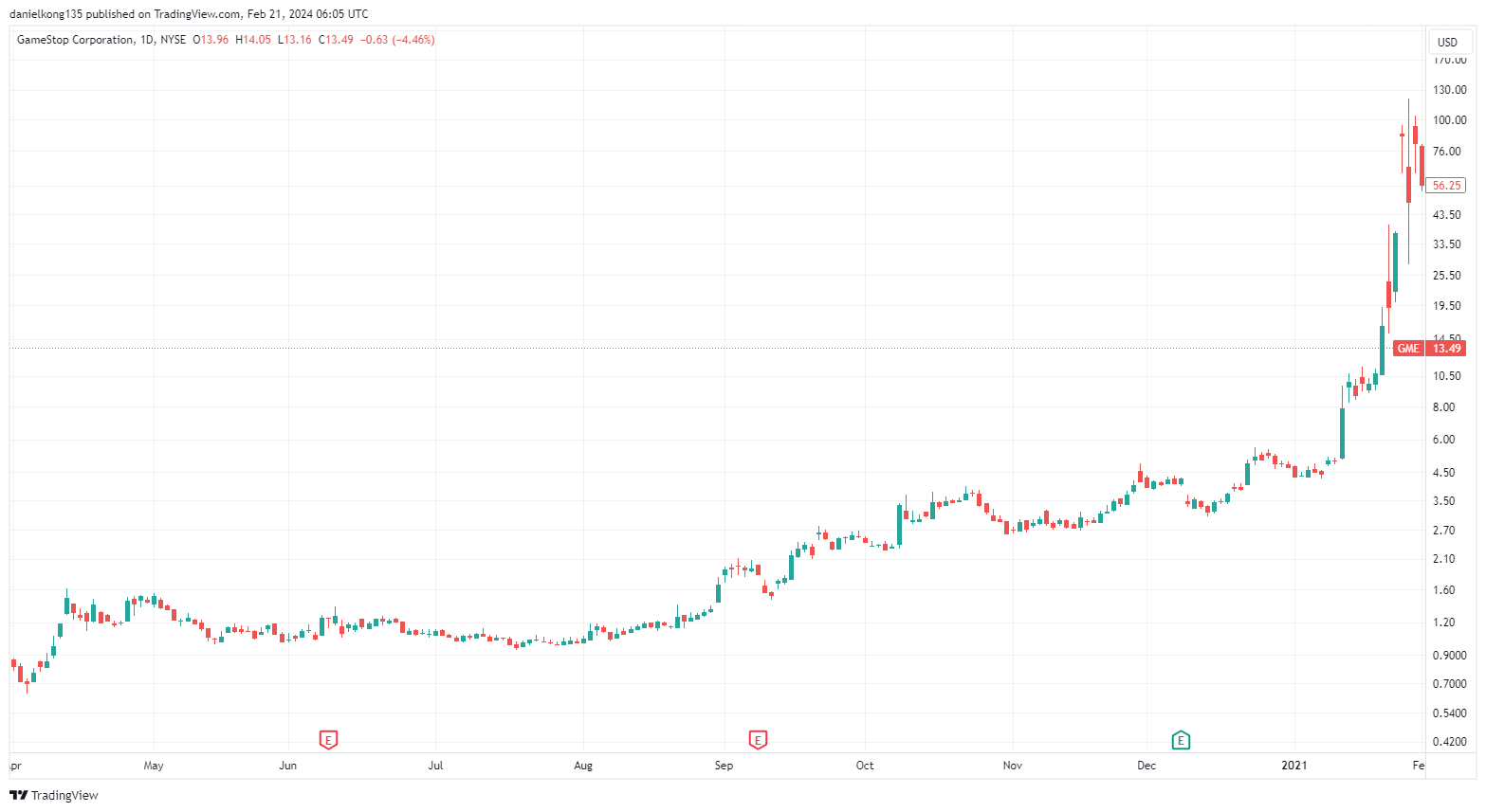 Cổ phiếu của GameStop, được giao dịch ở mức thấp 2,57 đô la một cổ phiếu vào tháng 4 năm 2020, đã tăng lên mức cao nhất là 483 đô la vào tháng 1 năm 2021 [2]. Sau đợt chia cổ phiếu 4 tặng 1 vào tháng 7 năm 2022, mức giá cao nhất được điều chỉnh trở thành 86,88 USD sau khi chia tách [3]. Điều này cho thấy tác động mạnh mẽ và nhanh chóng của hành vi đám đông của nhà đầu tư.