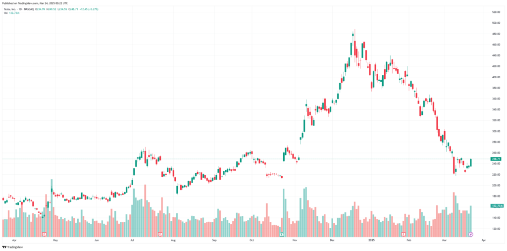 Cổ phiếu đã tăng nhẹ sau các thông báo vào đầu năm 2025 nhằm đẩy nhanh việc ra mắt các loại xe điện giá cả phải chăng hơn, dự kiến sẽ thúc đẩy khối lượng bán hàng và mở rộng thị trường. Bất chấp sự lạc quan này, cổ phiếu đã không tăng giá và phải đối mặt với sự sụt giảm thêm vào tháng 3 năm 2025 do số liệu bán hàng đáng thất vọng ở Trung Quốc và Châu Âu, cũng như các vấn đề về chất lượng đang diễn ra với Cybertruck [9].
