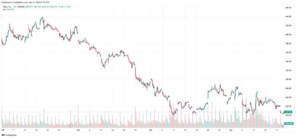 Biểu đồ 2: Hiệu suất giá cổ phiếu của Tesla từ tháng 1 năm 2025 đến tháng 4 năm 2025 (https://www.tradingview.com/x/bMguH4Au/)