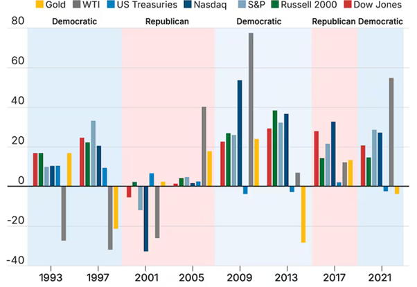Ảnh chụp màn hình ở trên biểu đồ hiệu suất thị trường của nhiều loại tài sản khác nhau trong năm sau cuộc bầu cử Tổng thống Hoa Kỳ. Bạn sẽ lưu ý rằng không có mô hình hoặc xu hướng rõ ràng nào liên quan đến đảng nào thắng cử. Điều duy nhất rõ ràng là thị trường phản ứng tích cực trong phần lớn thời gian.