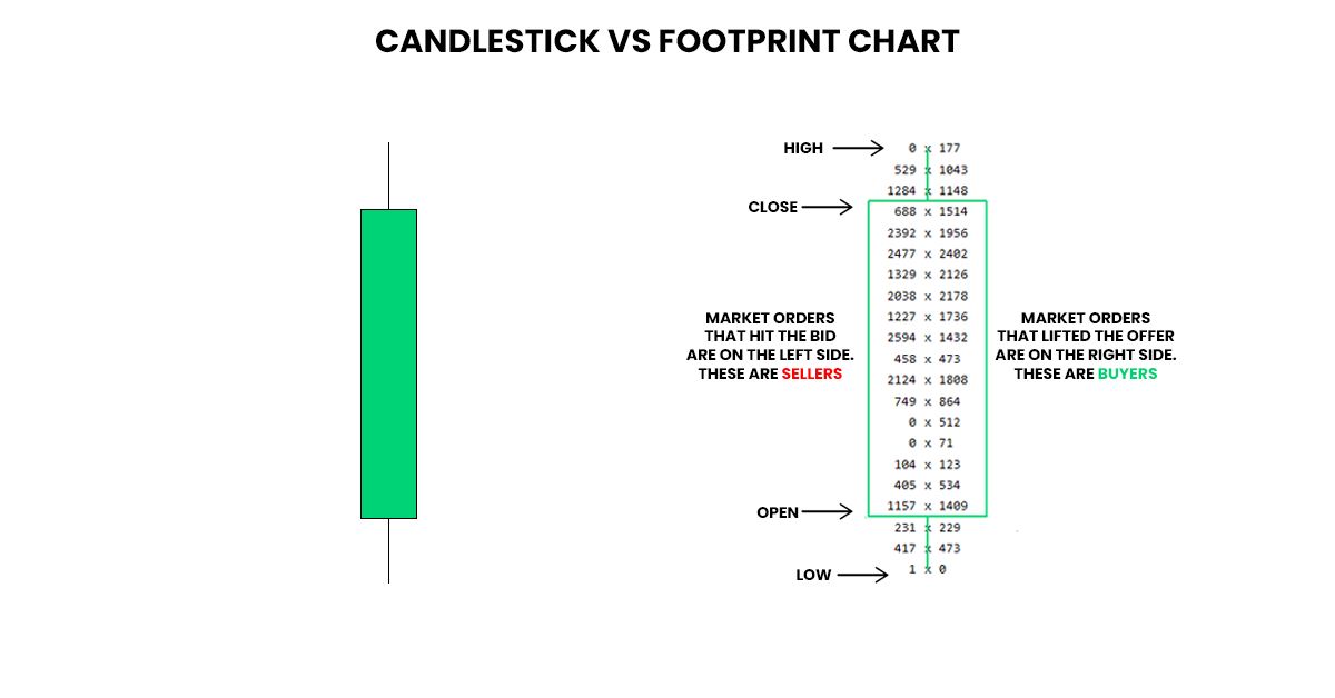 Hình ảnh 2: Biểu đồ nến truyền thống so với biểu footprint. Nguồn: https://coinomist.com/education/what-is-a-footprint-chart-and-how-to-read-it/